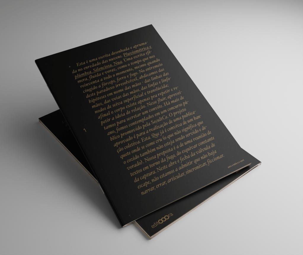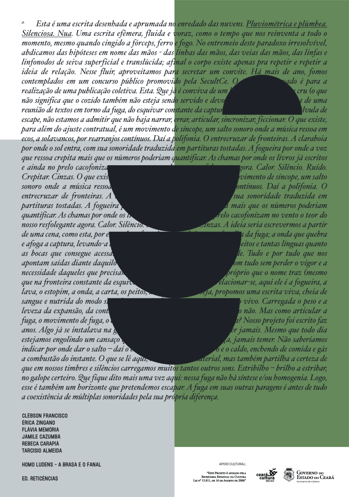 Composta por seis textos Homo Ludens – A Brasa e o Fanal é uma publicação que investiga a composição de estratégias e territórios fugitivos através da experiência da escrita. Organização: Flávia Memória e Tarcisio Almeida, com colaborações: Clébson Francisco, Érica Zingano, Flávia Memória, Jamile Cazumbá, Rebeca Carapiá, Tarcisio Almeida, e produção executiva: Natasha Silva