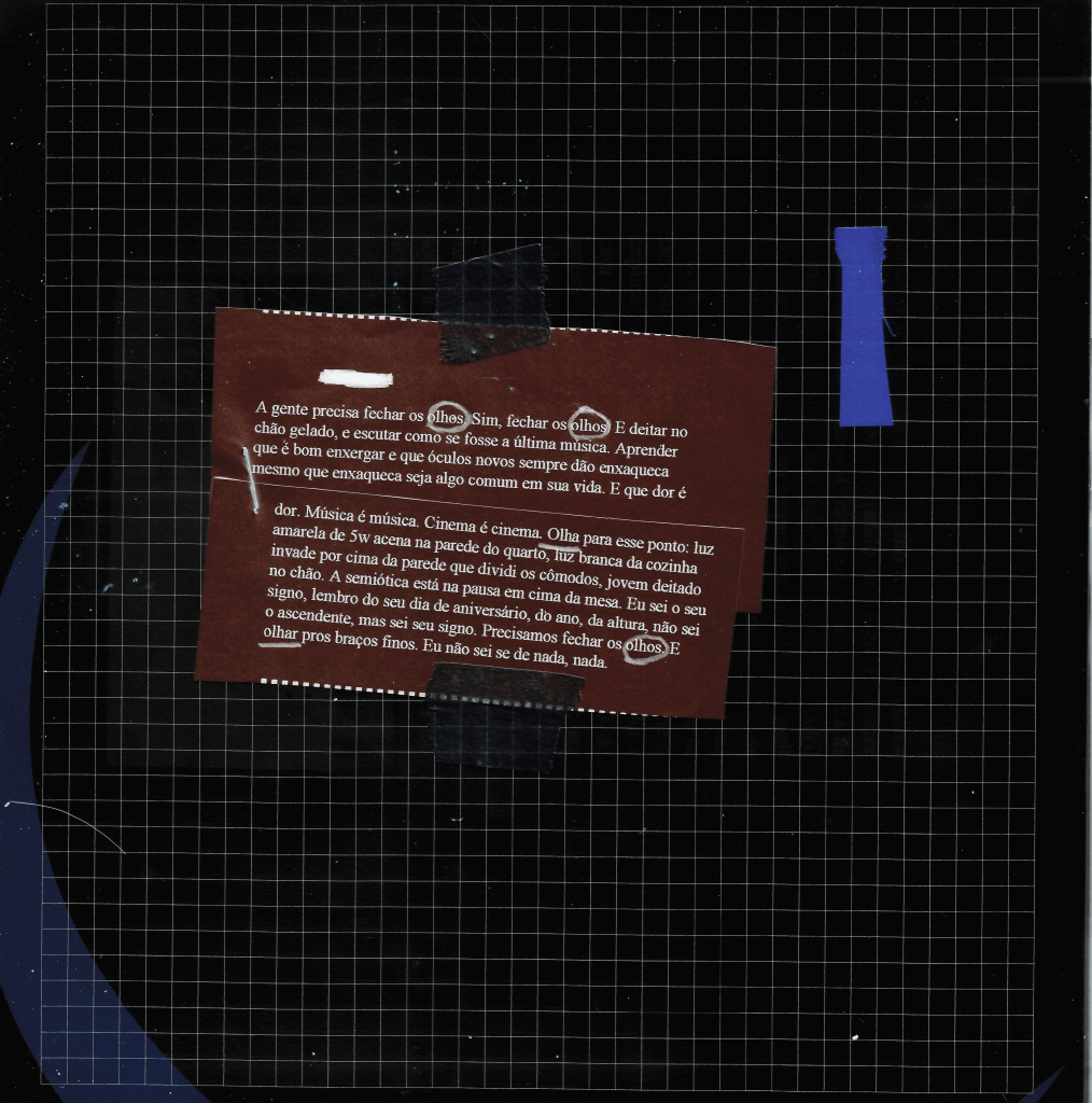 Sempre lembro quando cê me falou que “a melhor versão de nós nunca foi na agonia” e eu levei um tempo pra lembrar que era de uma música do Rico, e você riu. E a música continua com “na confusão dos ódios, na distração dos brancos. Cuide!”. 2 Para você de 2020, quero um beijo de despedida longe do nosso labirinto. Sempre acreditei que teria que continuar vivendo entre a pressa e a calma, entre estar acelerado e estar imóvel ao mesmo tempo, mas tenho abandonado essa ideia e seguido apenas quebrado para a frente. Mas cuide!, tenho sempre que lembrar disso para mim mesmo, cuide! Sempre digo em silêncio proteja sua memória, como uma oração silenciosa e seca para o futuro, como se eu tentasse acreditar na fé que eu mesmo não tenho.